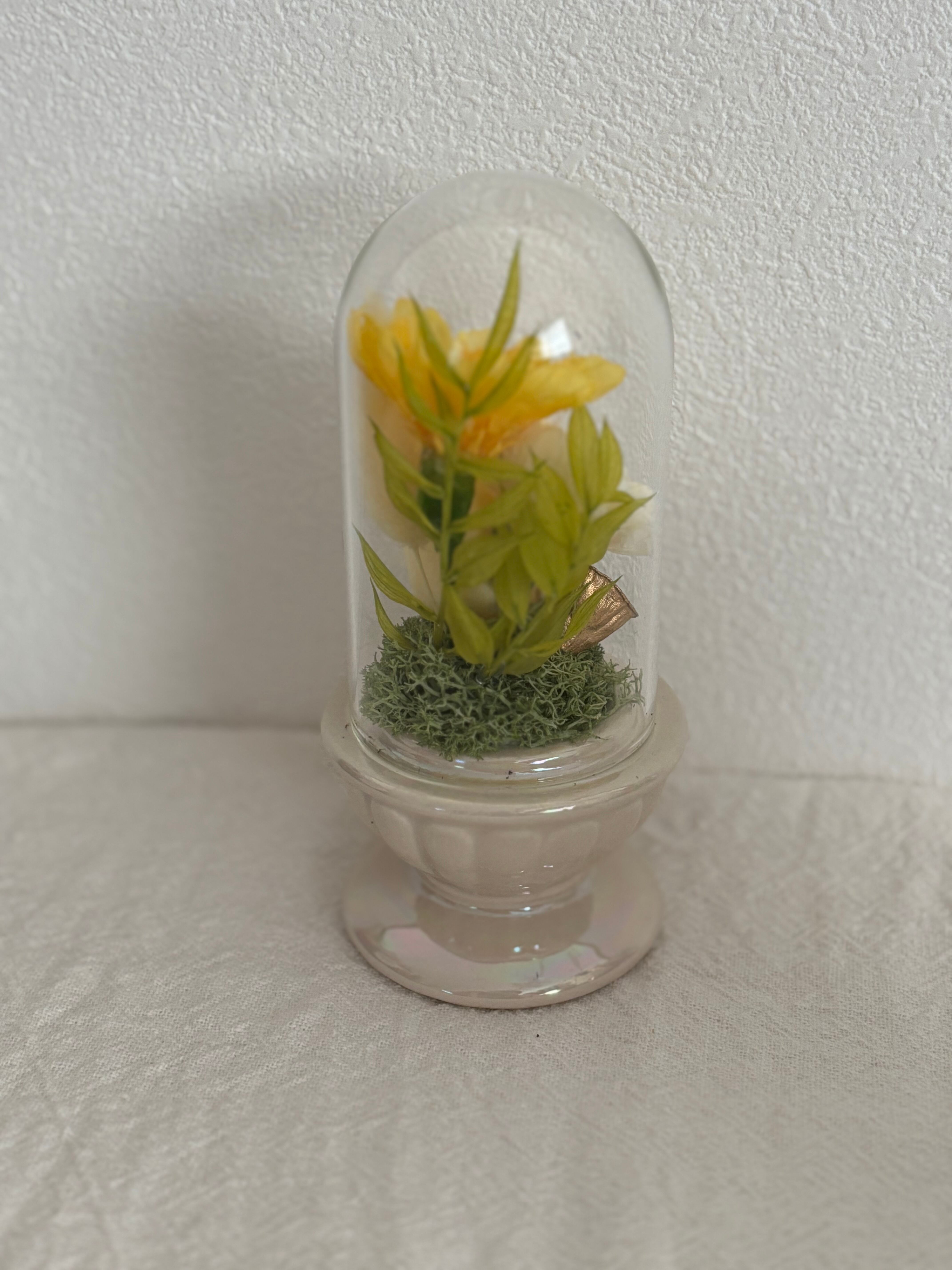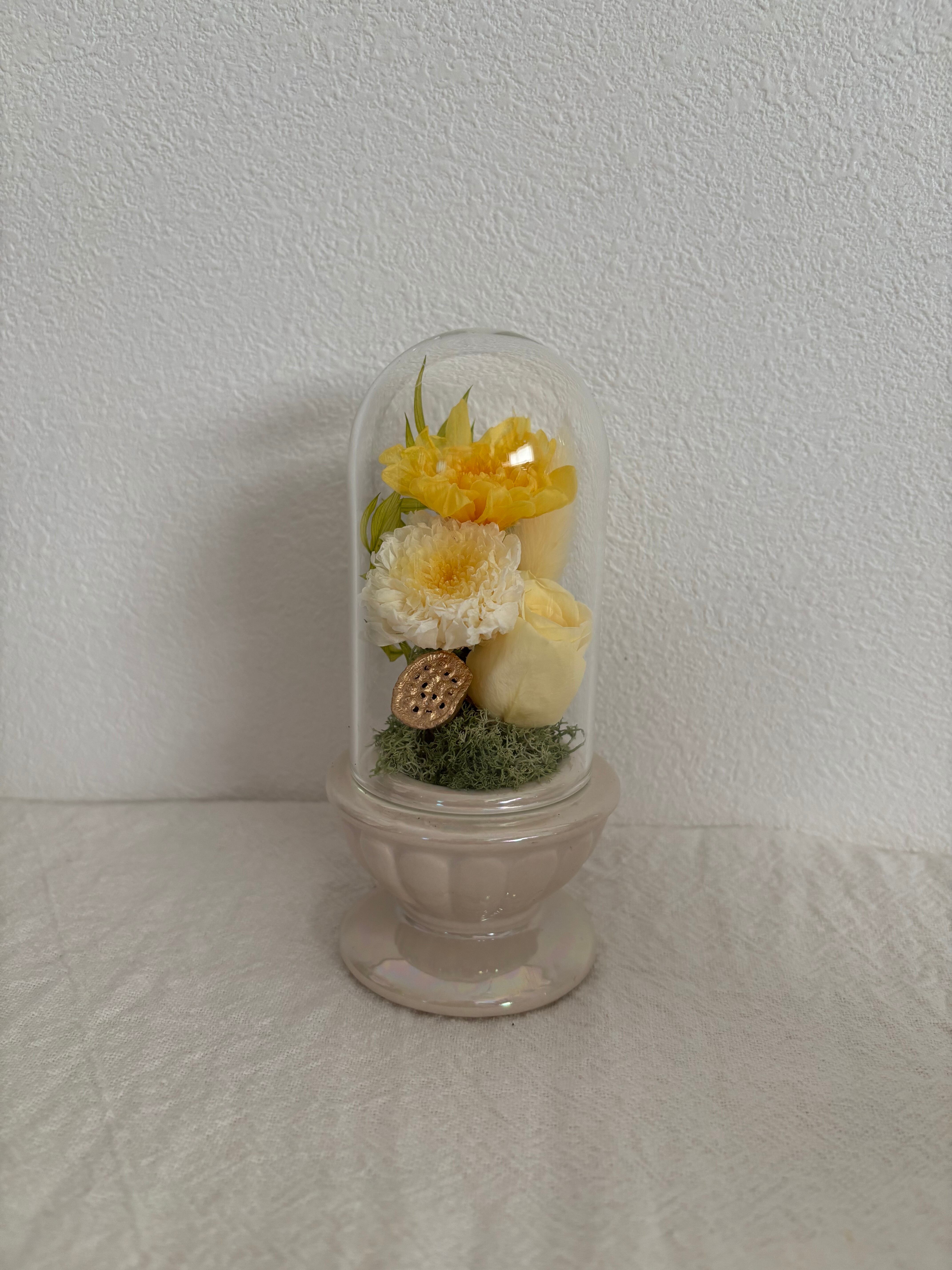 プリザーブドフラワーでできた小さなお供え花。やさしい色合いの花々は、大切な方への想いを静かに表現し、故人を偲ぶ特別なひとときにふさわしい存在感を放ちます。